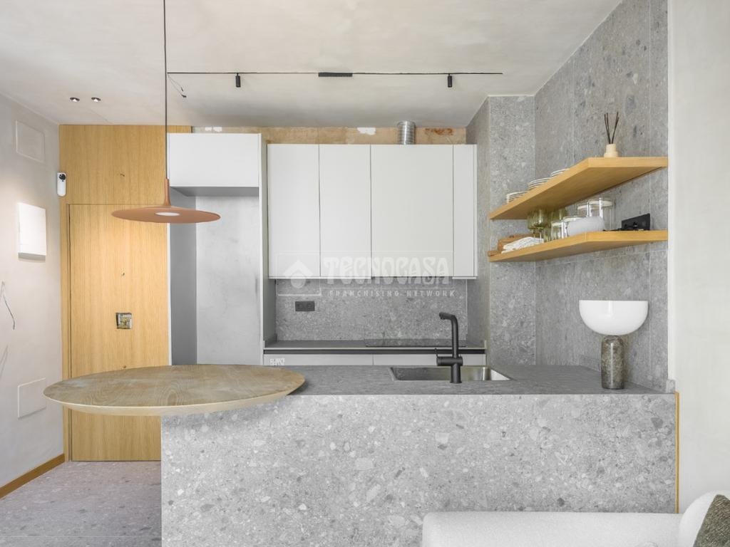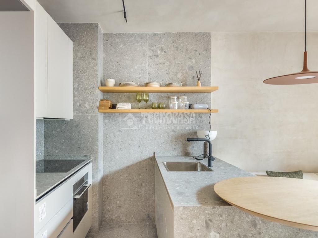 La zona de día se articula en un espacio abierto que integra salón, cocina y comedor, potenciando la amplitud y la luminosidad. La cocina, ejecutada en piedra natural con vetas cálidas, se acompaña de mobiliario a medida en tonos neutros y baldas de madera maciza que aportan personalidad y equilibrio. La barra en isla, con sobre redondeado de roble, invita tanto al desayuno informal como a largas sobremesas en compañía.