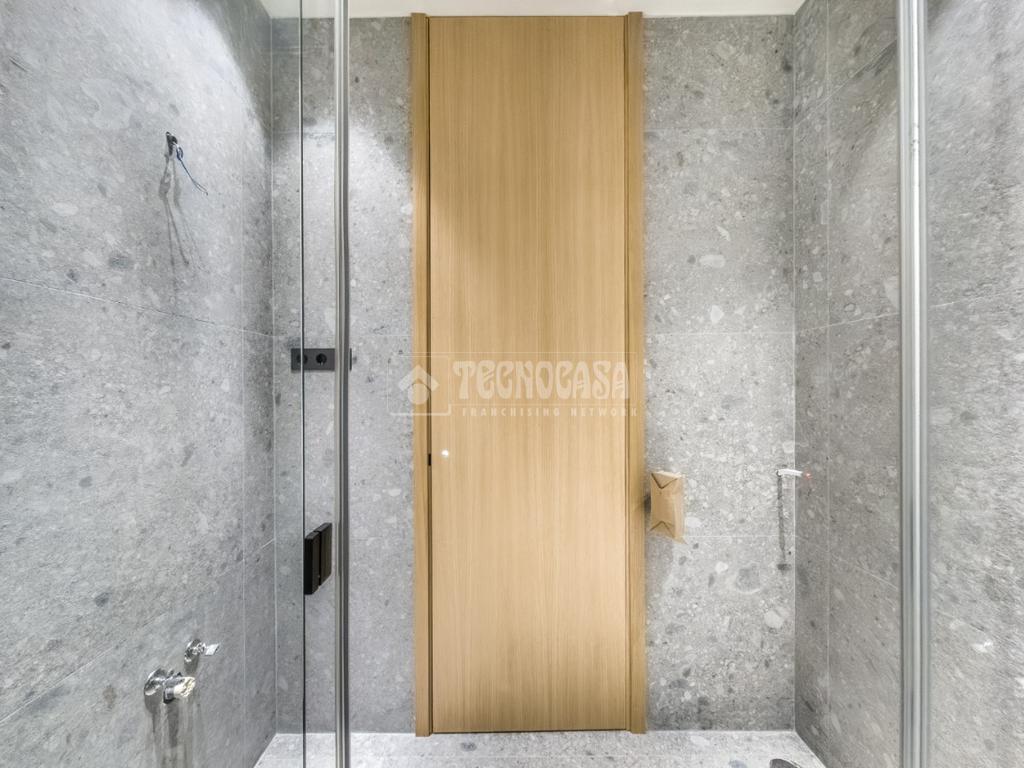El dormitorio principal es un refugio de calma, concebido con armarios empotrados hechos a medida que maximizan el almacenamiento sin renunciar a la armonía visual. El cabecero integrado y la ropa de cama en lino natural aportan una sensación de hotel boutique.